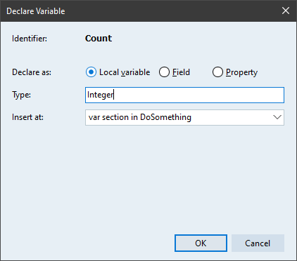 There’s a new editor expert in GExperts: Declare Variable. It lets you place the cursor on an undeclared identifier in the code editor and quickly declare it as a local variable, a class field, or a property.